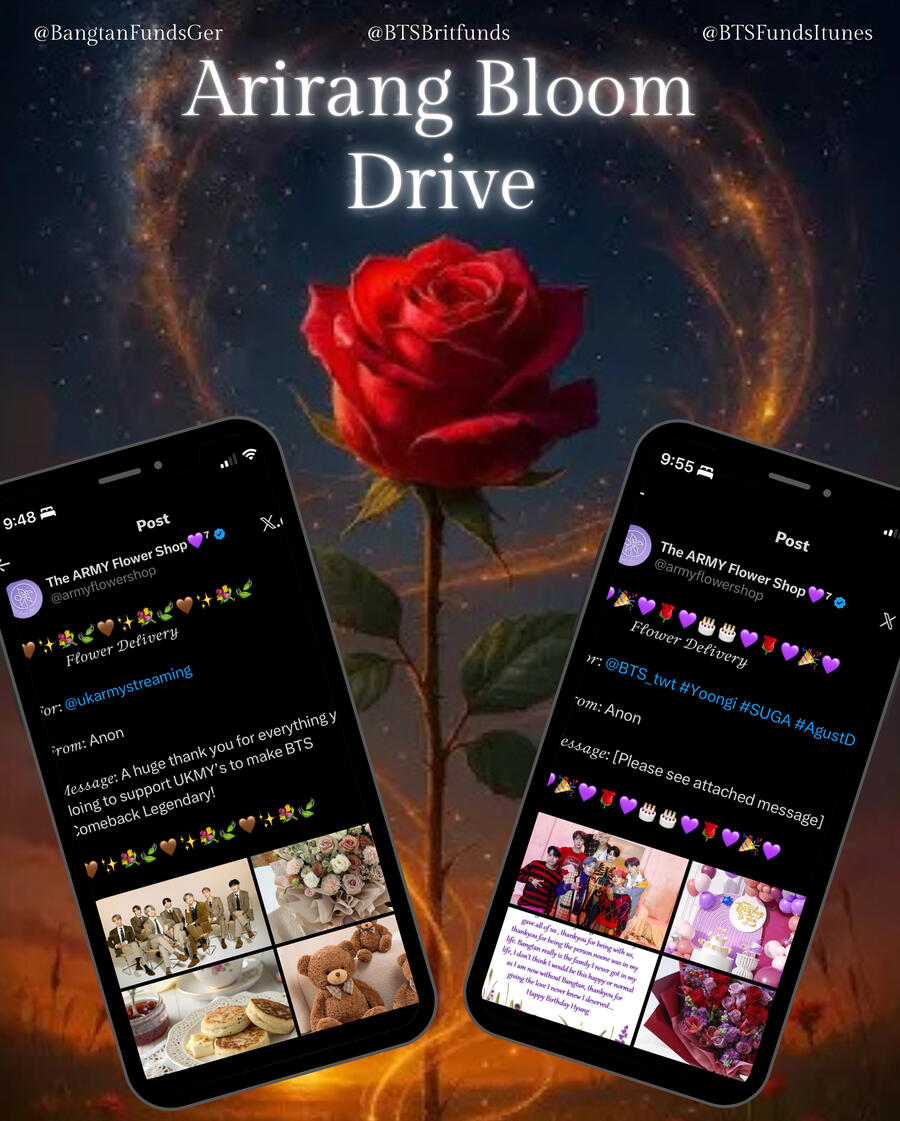Happy BTS CB! Pre celebrate Arirang release by sending a Digital Flower post to BTS, Army or one of the producers of Arirang πHuge thank you to @Armyflowershop for collaborating with funders & for the wonderful service of spreading joy & happiness in Army spaces!All donations are going towards BTS CB funds πPlease remember to leave your @ in donation message so we can match your order π«Άπ½